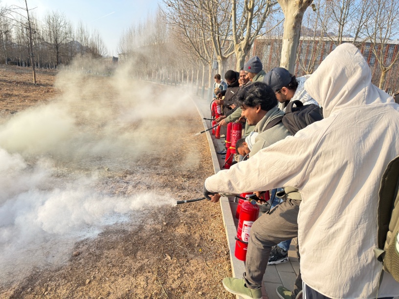 Following the theoretical sessions, the college organized a fire safety drill and hands-on training on the same day, December 11. Under professional guidance, the international students learned emergency response procedures and evacuation principles. During the critical hands-on fire extinguisher training, students personally practiced the "P.A.S.S." technique (Pull, Aim, Squeeze, Sweep), effectively translating theoretical knowledge into practical skills and significantly improving their emergency response capabilities and psychological preparedness for real-life fire scenarios.